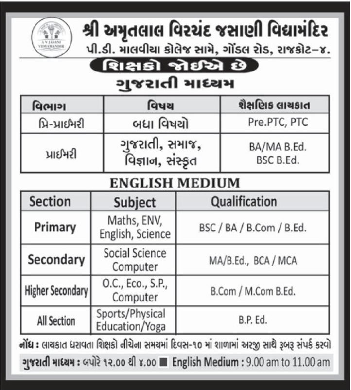 રાજકોટ શહેરમાં શૈક્ષણિક ક્ષેત્રે વર્ષોથી અગ્રેસર રહેલી સંસ્થા શ્રી અમૃતલાલ વિરચંદ જસાણી વિદ્યામંદિર (Shree Amrutlal Virchand Jasani Vidyamandir) દ્વારા નવા શૈક્ષણિક સત્ર માટે ઉત્સાહી અને લાયકાત ધરાવતા શિક્ષકોની ભરતી જાહેર કરવામાં આવી છે. આ સંસ્થા રાજકોટના ગોંડલ રોડ વિસ્તારમાં આવેલી છે અને વર્ષોથી ગુણવત્તાયુક્ત શિક્ષણ પૂરી પાડે છે. હાલમાં શાળાના ગુજરાતી અને અંગ્રેજી એમ બંને માધ્યમના વિવિધ વિભાગોમાં શિક્ષકોની જરૂરિયાત છે.