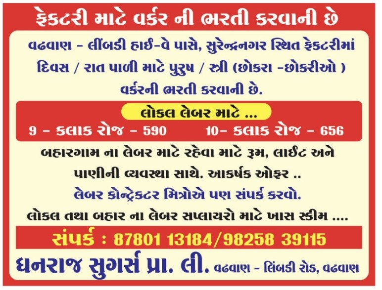 સુરેન્દ્રનગર જિલ્લાના વઢવાણ વિસ્તારમાં આવેલી જાણીતી કંપની ધનરાજ સુગર્સ પ્રા. લી. (Dhanraj Sugars Pvt. Ltd.) દ્વારા હાલમાં મોટા પાયે વર્કરોની ભરતી માટેની જાહેરાત કરવામાં આવી છે. આ કંપની ખાંડ ઉત્પાદન ક્ષેત્રે કાર્યરત હોવાથી અહીં કામ કરવાની ઉત્તમ તક રહેલી છે. આ ભરતીમાં ખાસ કરીને ઉત્પાદન પ્રક્રિયા અને ફેક્ટરીના વિવિધ વિભાગોમાં સહાયક તરીકે કામ કરવા ઈચ્છુક ઉમેદવારોને પ્રાધાન્ય આપવામાં આવશે. કંપની દ્વારા સ્થાનિક તેમજ બહારગામના એમ બંને પ્રકારના શ્રમિકો માટે રોજગારીની વ્યવસ્થા કરવામાં આવી છે.