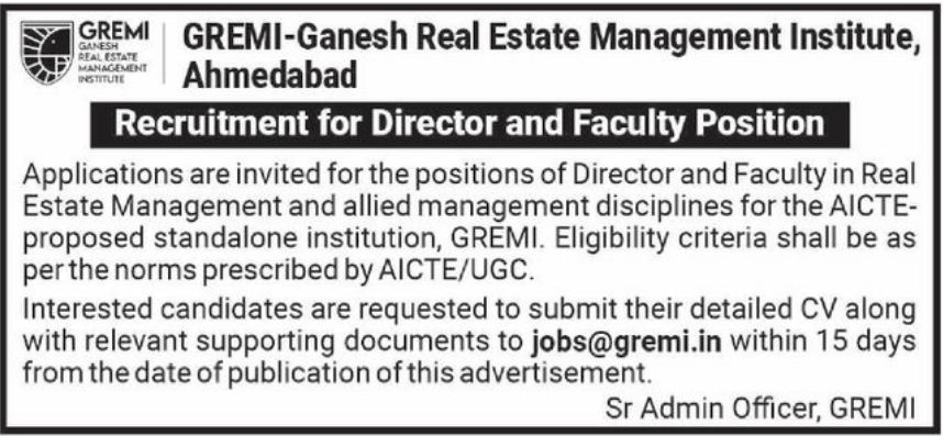GREMI-ગણેશ રિયલ એસ્ટેટ મેનેજમેન્ટ ઇન્સ્ટિટ્યૂટ દ્વારા બહાર પાડવામાં આવેલી આ ભરતી અમદાવાદમાં સ્થાયી થવા અને શિક્ષણ ક્ષેત્રે આગળ વધવા માંગતા વ્યાવસાયિકો માટે શ્રેષ્ઠ તક છે. AICTE ધોરણો મુજબના પદ હોવાથી આ એક પ્રતિષ્ઠિત કારકિર્દી વિકલ્પ સાબિત થઈ શકે છે. લાયક ઉમેદવારોએ મોડું કર્યા વગર પોતાના જરૂરી દસ્તાવેજો સાથે ઇમેઇલ દ્વારા અરજી કરી દેવી જોઈએ.