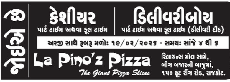રાજકોટ શહેરમાં ખાણી-પીણીના શોખીનો માટે જાણીતું નામ એટલે લા પીનોઝ પિઝા (La Pino’z Pizza). આ કંપની તેના ‘જાયન્ટ પિઝા સ્લાઈસ’ માટે સમગ્ર ભારતમાં પ્રખ્યાત છે. હાલમાં, રાજકોટ સ્થિત તેમની શાખા દ્વારા વિવિધ પદો પર નવી ભરતીની જાહેરાત કરવામાં આવી છે.