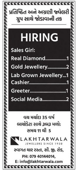 લખતરવાલા જ્વેલર્સ જેવી નામાંકિત સંસ્થામાં જોડાવાની આ એક ઉત્તમ તક છે. અમદાવાદના હાર્દ સમાન સી. જી. રોડ પર કામ કરવાથી તમને સારો એક્સપોઝર મળશે. જો તમે 35 વર્ષથી ઓછી ઉંમરના છો અને જ્વેલરી અથવા સેલ્સ ક્ષેત્રે રુચિ ધરાવો છો, તો ચોક્કસપણે રૂબરૂ મુલાકાત લેવી જોઈએ.