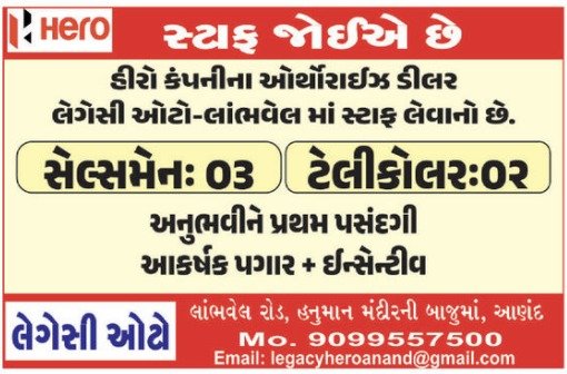 જો તમે આણંદમાં નોકરી શોધી રહ્યા છો અને હીરો જેવી પ્રતિષ્ઠિત કંપનીના ડીલર સાથે જોડાઈને પ્રગતિ કરવા માંગો છો, તો લેગેસી ઓટોમાં મળેલી આ તક ઝડપી લેવા જેવી છે. સેલ્સમેન કે ટેલીકોલર તરીકેની આ પોસ્ટ્સ તમને પ્રોફેશનલ દુનિયામાં સારો અનુભવ અપાવશે.
