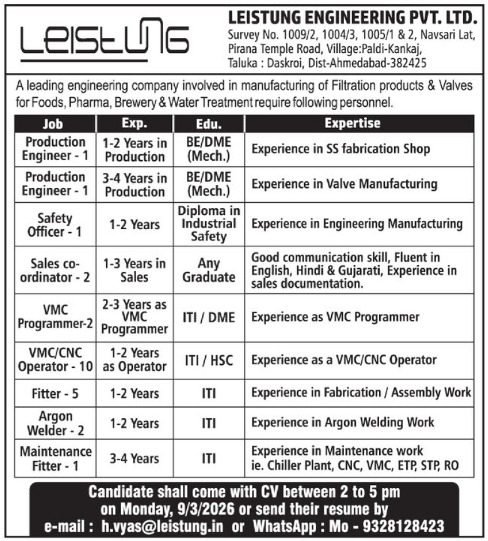 લેઈસ્ટુંગ એન્જિનિયરિંગ પ્રાઈવેટ લિમિટેડ (Leistung Engineering Pvt. Ltd.) દ્વારા અમદાવાદ ખાતે વિવિધ ટેકનિકલ અને નોન-ટેકનિકલ પદો માટે ભરતીની જાહેરાત કરવામાં આવી છે. આ કંપની મુખ્યત્વે ફિલ્ટરેશન પ્રોડક્ટ્સ અને વાલ્વના ઉત્પાદન સાથે સંકળાયેલી છે, જેનો ઉપયોગ ફૂડ, ફાર્માસ્યુટિકલ, બ્રુઅરી અને વોટર ટ્રીટમેન્ટ જેવા ઉદ્યોગોમાં થાય છે.