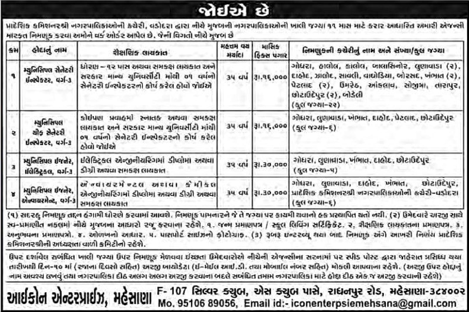જો તમે મહેસાણા કે વડોદરાની આસપાસના વિસ્તારમાં રહો છો અને નગરપાલિકામાં એન્જિનિયરિંગ અથવા હેલ્થ સેક્ટરમાં કારકિર્દી બનાવવા માંગો છો, તો આ એક સારો વિકલ્પ છે. નિયત સમયમર્યાદામાં તમારી અરજી મોકલી આપવા વિનંતી છે. વધુ માહિતી માટે તમે આઇકોન એન્ટરપ્રાઇઝનો સંપર્ક 95106 89056 પર અથવા iconenterpsiemehsana@gmail.com પર કરી શકો છો.