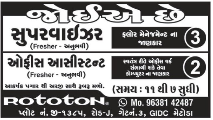 રોટોટોન, મેટોડા દ્વારા બહાર પાડવામાં આવેલી આ ભરતી રાજકોટના સ્થાનિક યુવાનો માટે રોજગારીની એક સુવર્ણ તક છે. આકર્ષક પગાર અને સારી સુવિધાઓ સાથે અહીં કામ કરીને તમે ઉદ્યોગ જગતનો સારો અનુભવ મેળવી શકો છો. લાયકાત ધરાવતા તમામ ઉમેદવારોએ વિલંબ કર્યા વગર રૂબરૂ મુલાકાત લેવી જોઈએ.