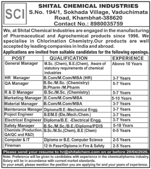 શિતલ કેમિકલ ઇન્ડસ્ટ્રીઝ (Shital Chemical Industries) દ્વારા વિવિધ વહીવટી અને ટેકનિકલ પોસ્ટ્સ માટે લાયક ઉમેદવારો પાસેથી અરજીઓ મંગાવવામાં આવી છે. આ કંપની વર્ષ 1996 થી ફાર્માસ્યુટિકલ અને એગ્રોકેમિકલ ઉત્પાદનોના મેન્યુફેક્ચરિંગ ક્ષેત્રે કાર્યરત છે. ખાસ કરીને ‘ક્લોરીનેશન કેમેસ્ટ્રી’માં નિપુણતા ધરાવતી આ કંપની ભારતમાં તેમજ વિદેશમાં જાણીતી કંપનીઓ સાથે જોડાયેલી છે. હાલમાં ખંભાત સ્થિત તેમના પ્લાન્ટ માટે નીચે મુજબની વિવિધ જગ્યાઓ પર ભરતી પ્રક્રિયા હાથ ધરવામાં આવી છે.