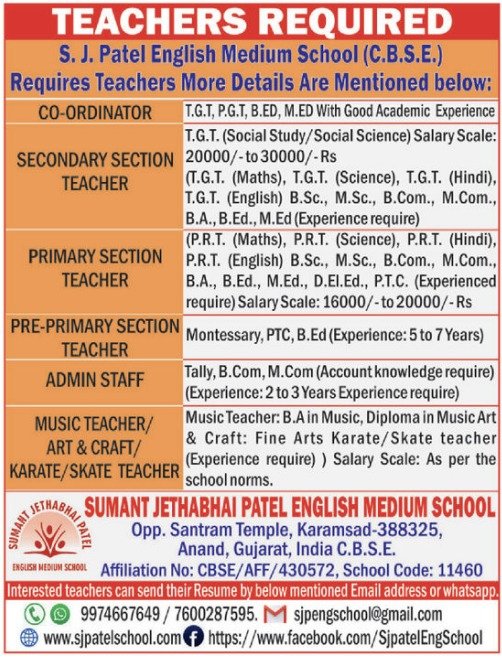 એસ. જે. પટેલ ઇંગ્લીશ મીડિયમ સ્કૂલ, આણંદ ખાતેની આ ભરતી અનુભવી અને ઉત્સાહી શિક્ષકો માટે એક સુવર્ણ તક છે. આકર્ષક પગાર અને સારા શૈક્ષણિક વાતાવરણમાં કામ કરવા ઈચ્છતા લોકોએ આપેલ સંપર્ક સૂત્રો દ્વારા વહેલી તકે સંપર્ક કરવો જોઈએ.