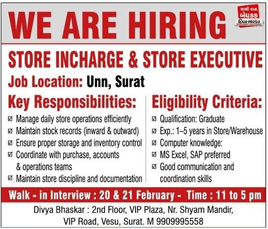 ગુજરાતના અગ્રણી મીડિયા હાઉસ દિવ્ય ભાસ્કર (Divya Bhaskar) દ્વારા સુરત ખાતે નવી જગ્યાઓ માટે ભરતીની જાહેરાત કરવામાં આવી છે. હાલમાં કંપની દ્વારા સ્ટોર ઇનચાર્જ (Store Incharge) અને સ્ટોર એક્ઝિક્યુટિવ (Store Executive) ની મહત્વની ભૂમિકાઓ માટે લાયક ઉમેદવારોની શોધ કરવામાં આવી રહી છે. જો તમે સ્ટોર મેનેજમેન્ટ અથવા વેરહાઉસિંગ ક્ષેત્રે તમારી કારકિર્દી બનાવવા માંગતા હોવ, તો આ એક ઉત્તમ તક છે. દિવ્ય ભાસ્કર જેવી પ્રતિષ્ઠિત સંસ્થા સાથે કામ કરવાથી તમને વ્યાવસાયિક વાતાવરણમાં ઘણું શીખવા મળશે.