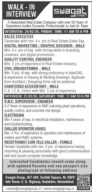 સ્વાગત ગ્રુપ (Swagat Group) દ્વારા અમદાવાદ ખાતે વિવિધ ટેકનિકલ અને બિન-ટેકનિકલ જગ્યાઓ માટે ભરતીની જાહેરાત કરવામાં આવી છે. સ્વાગત ગ્રુપ રિયલ એસ્ટેટ ક્ષેત્રમાં 50 વર્ષથી વધુનો બહોળો અનુભવ ધરાવતી એક પ્રતિષ્ઠિત કંપની છે. આ કંપની હાલમાં તેના પ્રોજેક્ટ્સ અને ટીમના વિસ્તરણ માટે ગતિશીલ અને કુશળ પ્રોફેશનલ્સની શોધમાં છે. જો તમે રિયલ એસ્ટેટ ક્ષેત્રે તમારી કારકિર્દી બનાવવા માંગતા હોવ, તો આ એક ઉત્તમ તક છે.