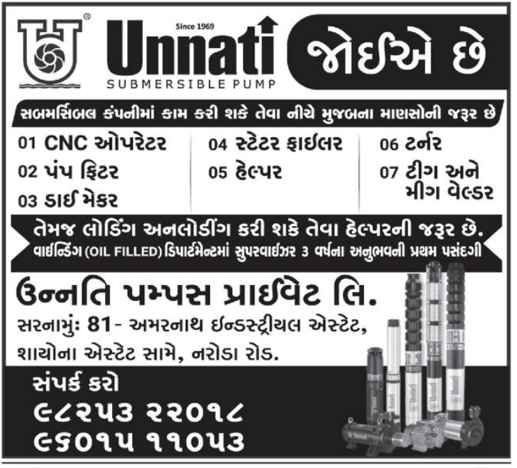 ઉન્નતી પમ્પસ પ્રાઈવેટ લિ. (Unnati Submersible Pump) એ વર્ષ 1969 થી પમ્પ ઉત્પાદન ક્ષેત્રે કાર્યરત એક પ્રતિષ્ઠિત કંપની છે. હાલમાં આ કંપની દ્વારા તેમના ઉત્પાદન એકમ માટે વિવિધ ટેકનિકલ અને બિન-ટેકનિકલ જગ્યાઓ પર ભરતીની જાહેરાત કરવામાં આવી છે. આ ભરતી મુખ્યત્વે સબમર્સિબલ પમ્પ ઉત્પાદન સાથે સંકળાયેલા કામો માટે છે.