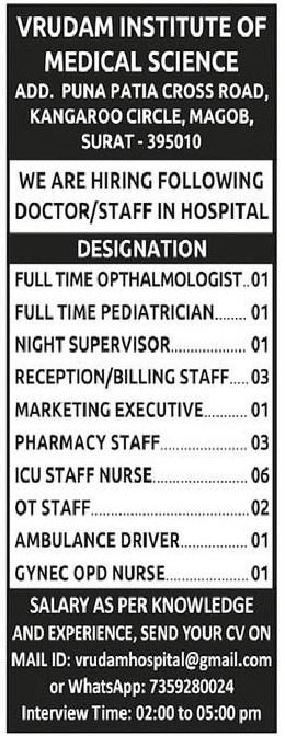 સુરત શહેરના મેડિકલ ક્ષેત્રે કાર્યરત વૃદમ ઈન્સ્ટિટ્યૂટ ઓફ મેડિકલ સાયન્સ (Vrudam Institute of Medical Science) દ્વારા હોસ્પિટલના વિવિધ વિભાગો માટે નવી ભરતીની જાહેરાત કરવામાં આવી છે. આ સંસ્થા સુરતના મગોબ વિસ્તારમાં આવેલી છે અને દર્દીઓની સારવાર માટે જાણીતી છે. હાલમાં હોસ્પિટલના વિસ્તરણ અને બહેતર સુવિધાઓ પૂરી પાડવા માટે કુશળ ડોક્ટર્સ, નર્સિંગ સ્ટાફ અને અન્ય વહીવટી કર્મચારીઓની જરૂરિયાત ઉભી થઈ છે.